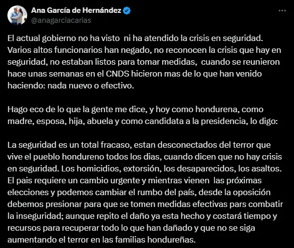 Honduras.- La ex primera dama y ahora precandidata presidencial por el Partido Nacional, Ana García de Hernández, ha lanzado severas críticas hacia la gestión de seguridad en el país, calificándola como un «total fracaso».